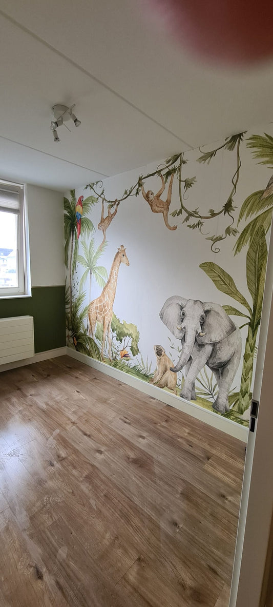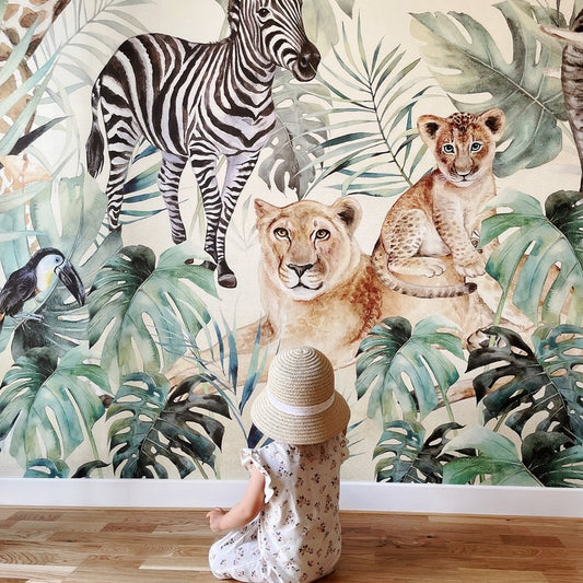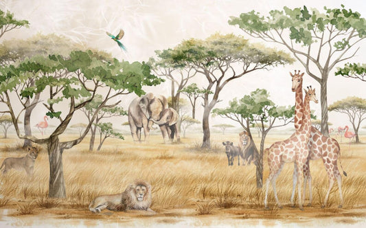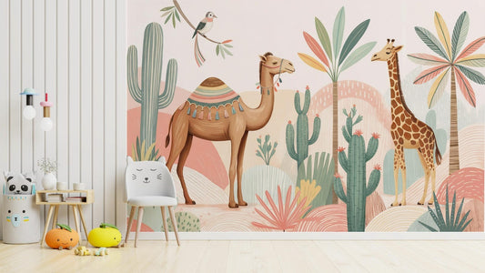 Papel para paredes animales de safari y desierto con camellos, jirafas y cactus.