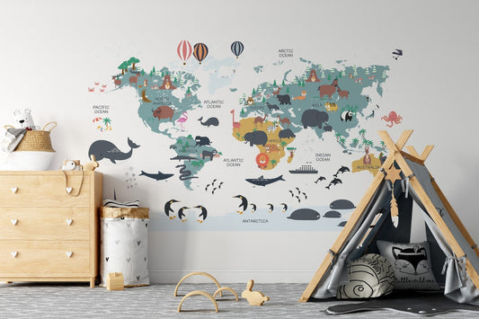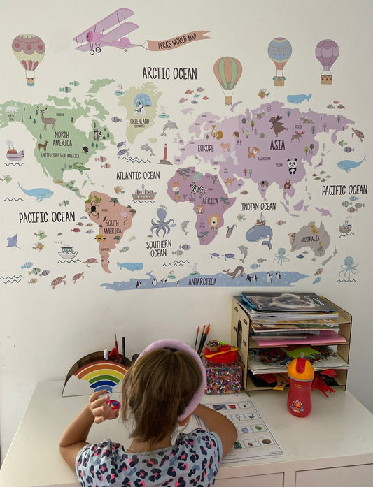 Mapa mundi infantil Niña Rosado animales, avion y globos