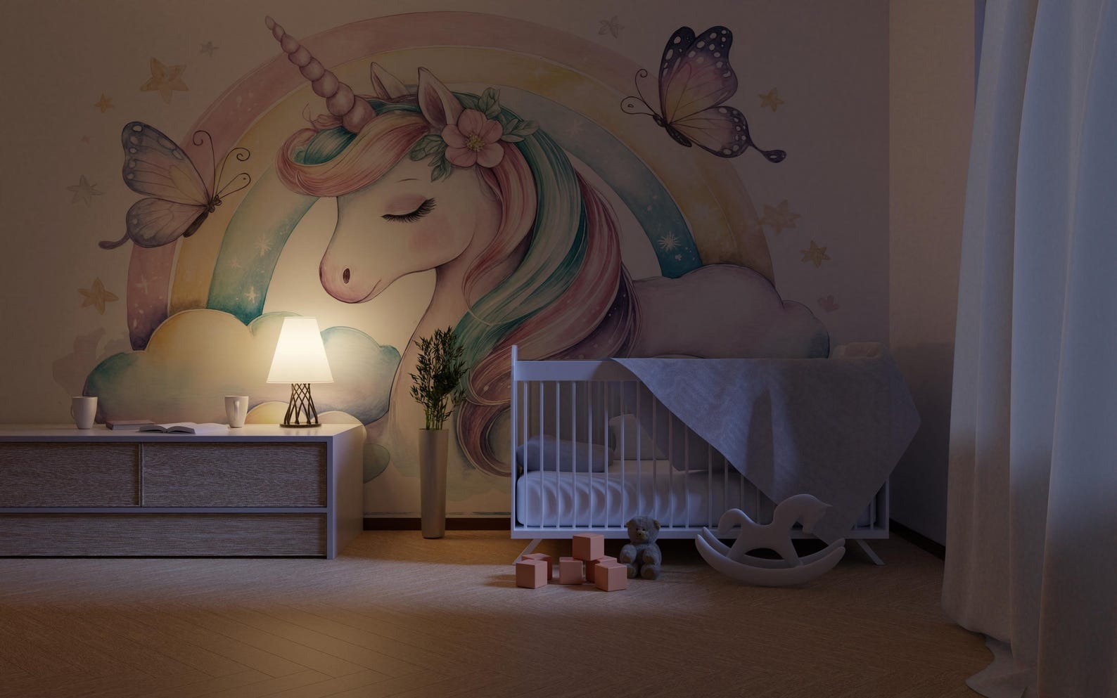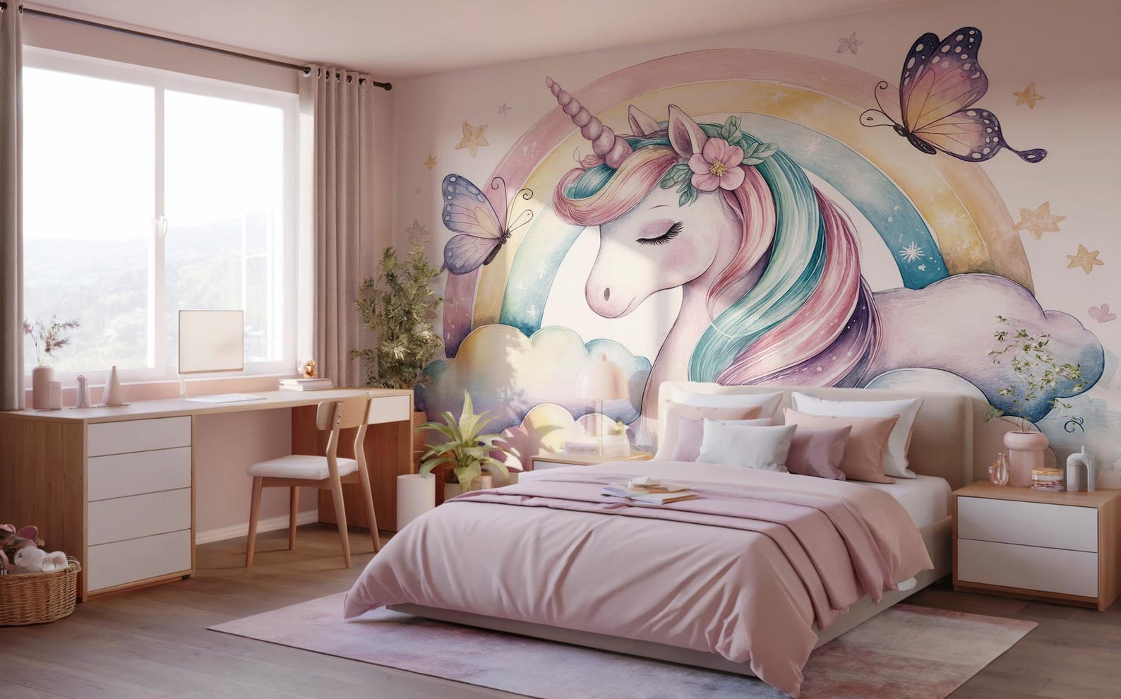 Papel para paredes Unicornio con Arcoiris y Mariposas